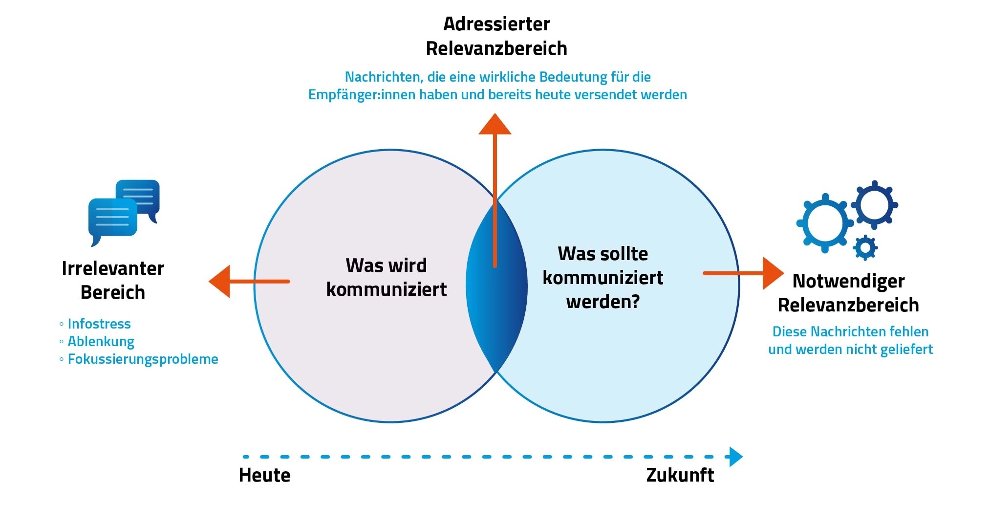 Neben diesem Beispiel aus dem Vertriebsbereich lassen sich viele weitere Anwendungsbereiche identifizieren, in denen Informationen zwar grundsätzlich vorhanden sind, aber die Anwender:innen nicht erreichen. Dieser Teil der Informationen, die in einem Unternehmen für die Produktivität der Mitarbeitenden eine Rolle spielen, wird in der nachfolgenden Abbildung als notwendiger Relevanzbereich bezeichnet. Für solche Informationen gibt es in den meisten Unternehmen jedoch in der Regel noch keine Versorgung.