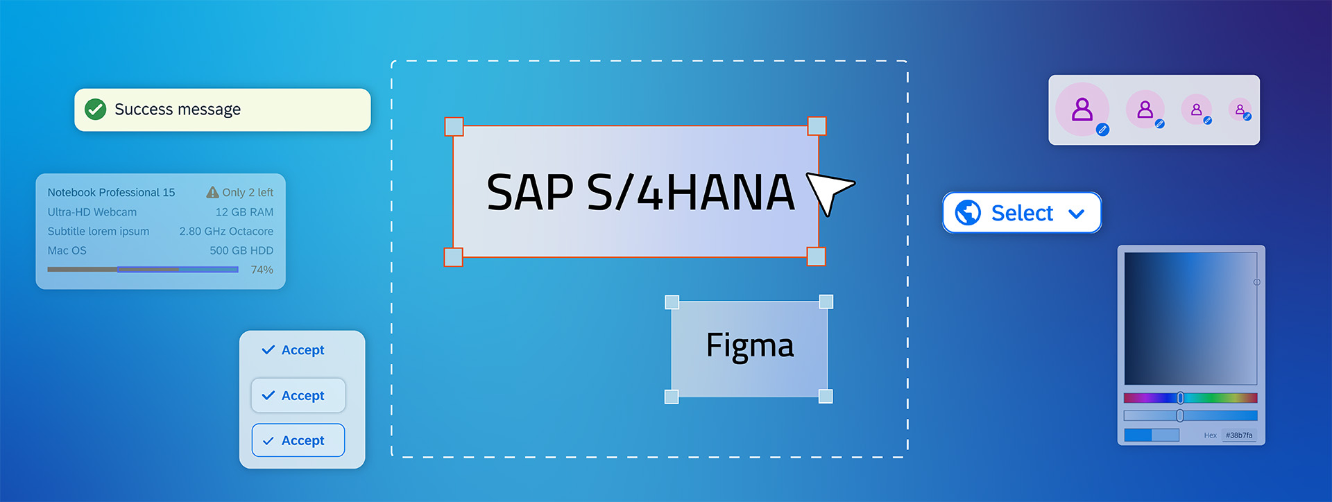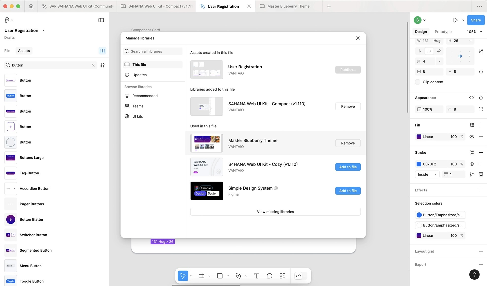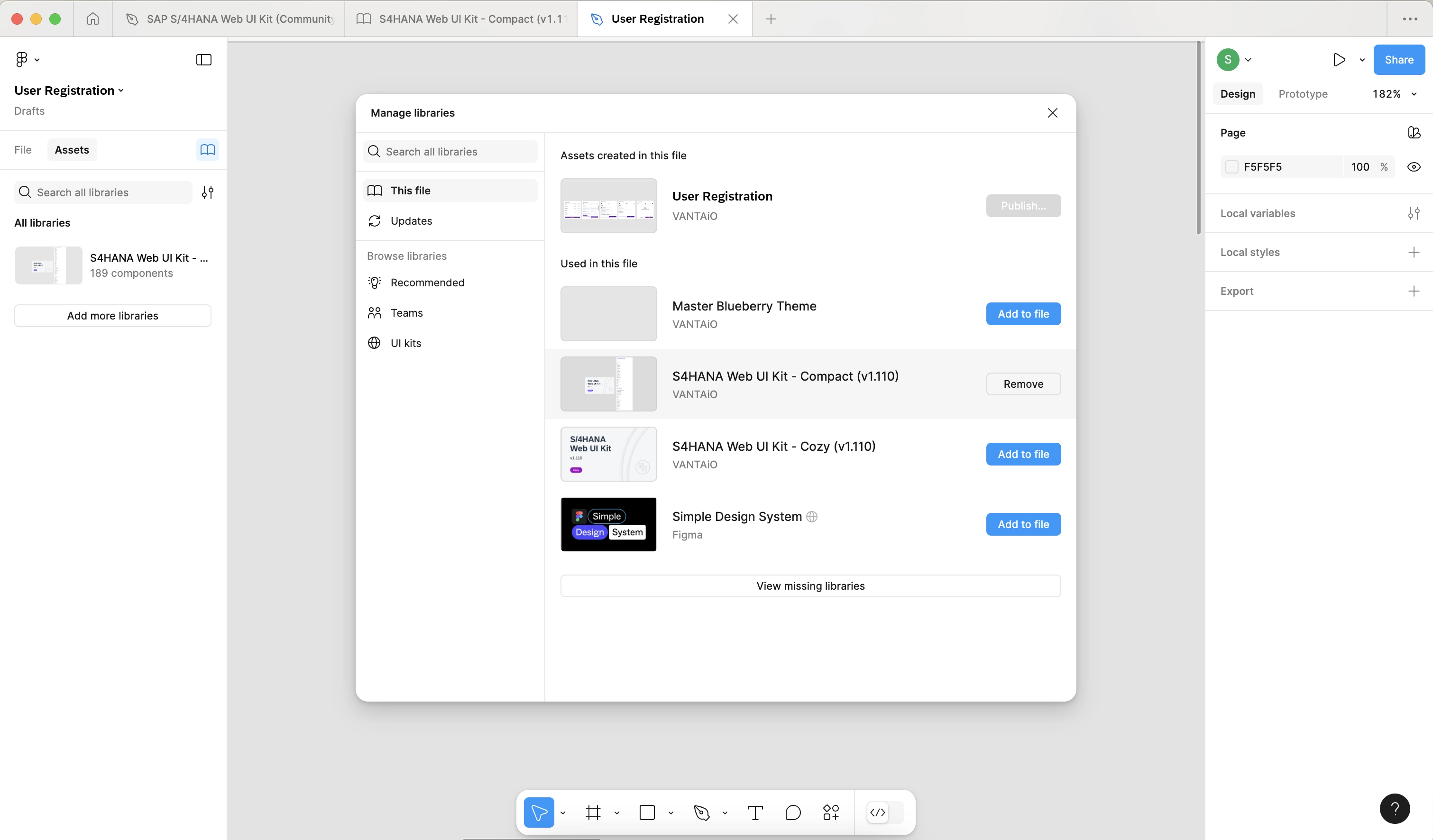 Libraries can be loaded within Figma to use templates such as specific components, interaction patterns and layouts. SAP also offers its own library with a large selection of UI components.