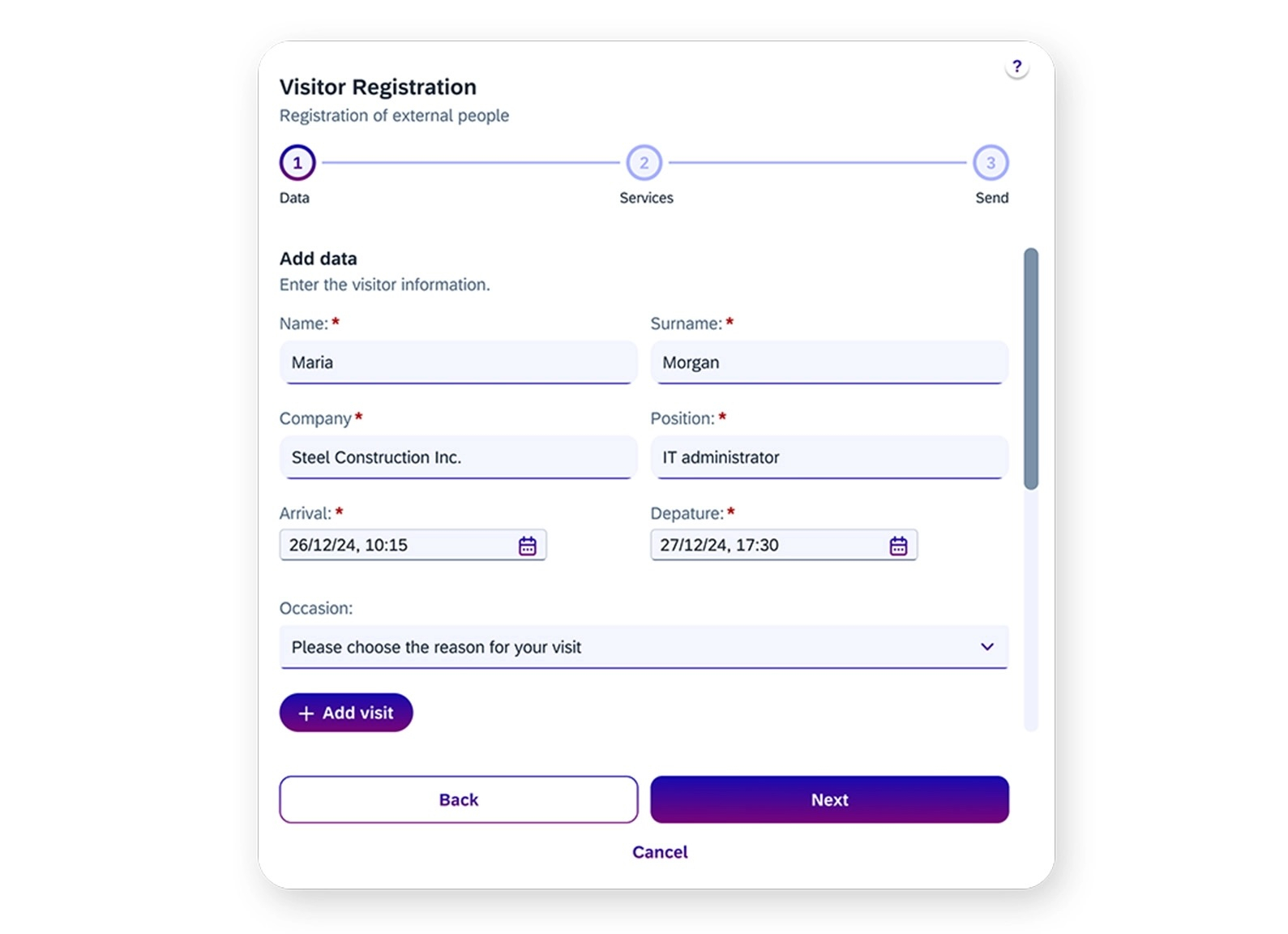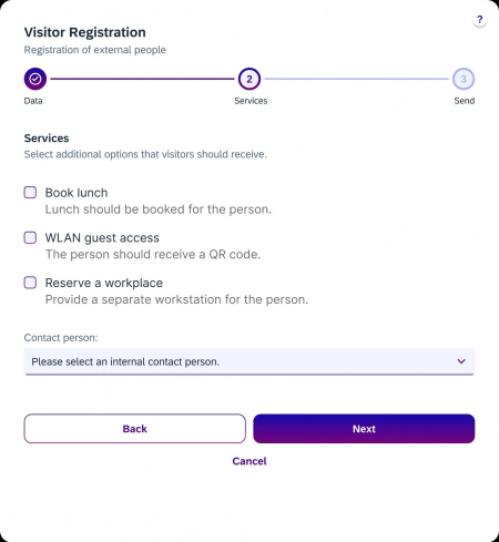 I would like to divide the visitor registration process on the card into several steps. The multi-stage process in the card ensures clear, focused user guidance and enables better checking of entries and prevents the card from appearing overloaded with too much information.
