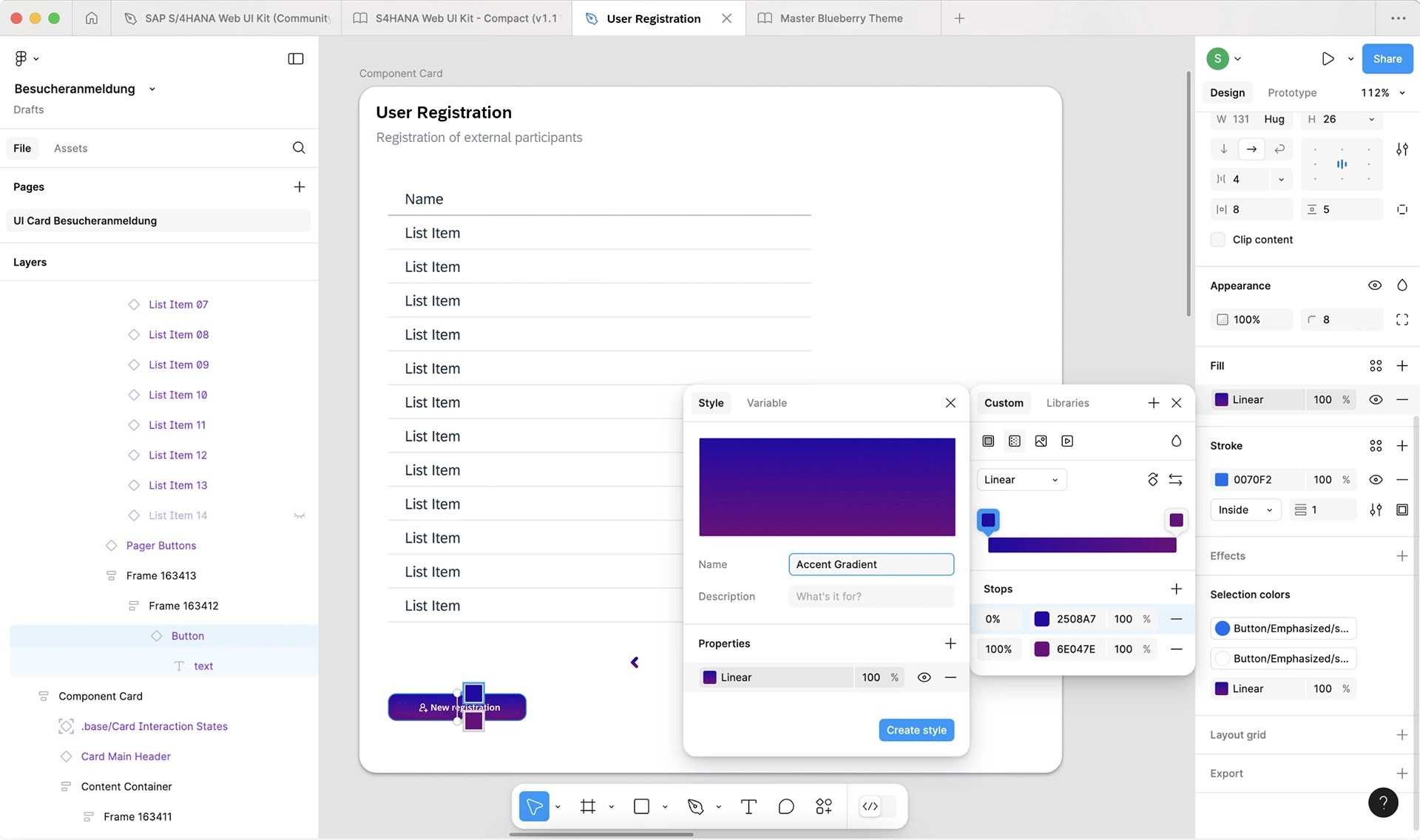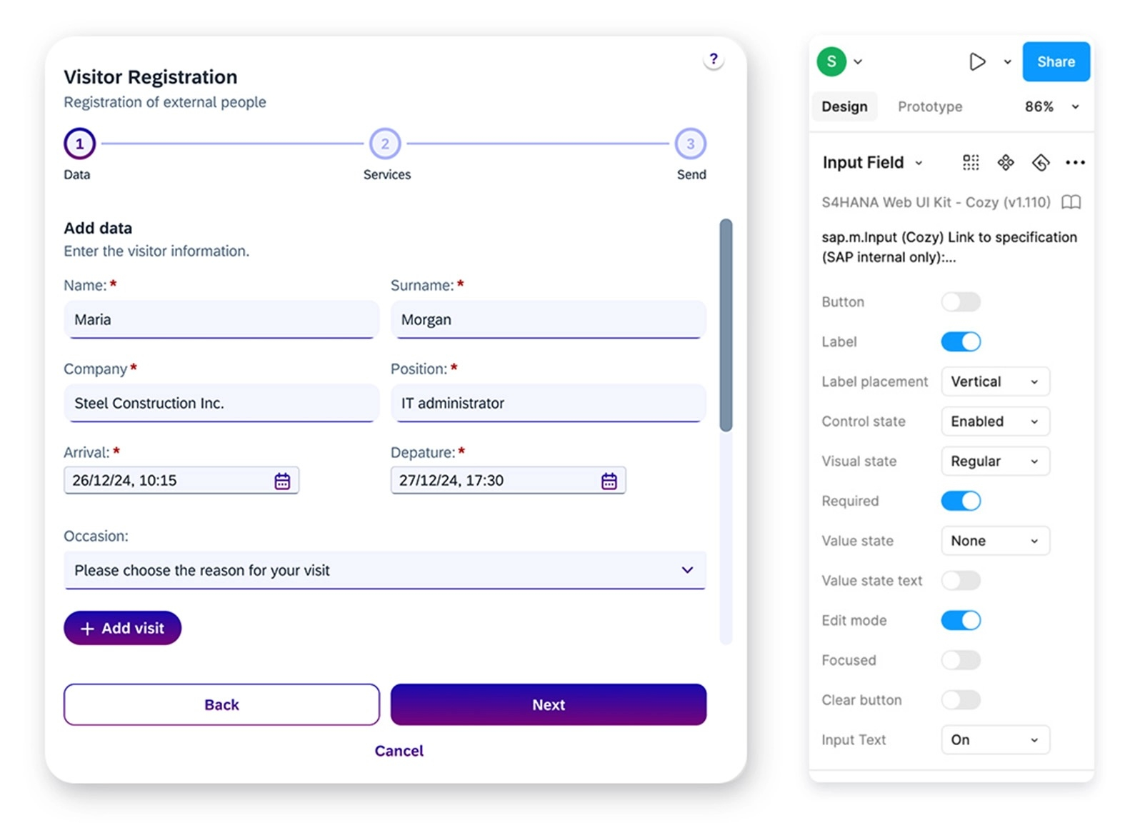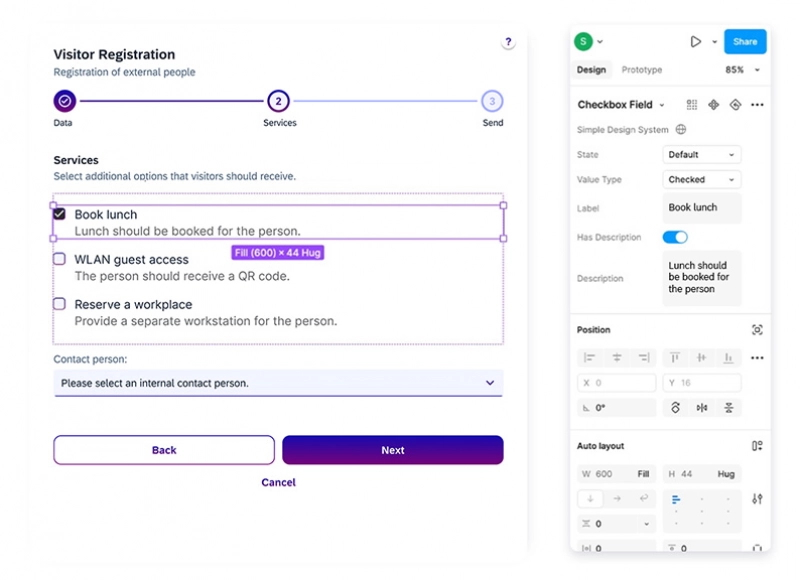 In my current project, I visualized a UI card for visitor registration with the prototyping tool Figma. The SAP Fiori Web UI Kit in Figma was used to develop a solution that both complies with the Fiori Design Guidelines and allows for specific customizations.