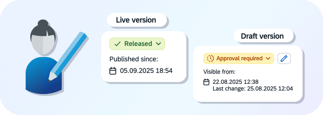 Content can be edited in a secure working version without affecting the published live version. This keeps the publication status stable until changes are specifically approved.