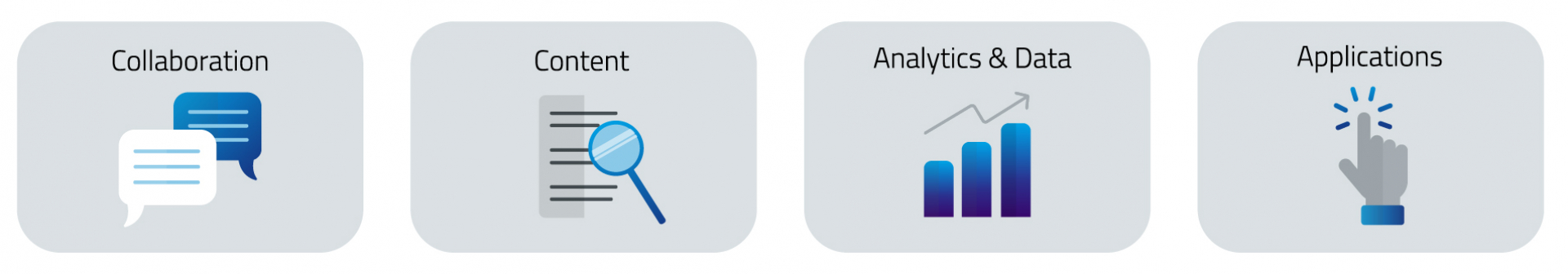 The tight connection of the areas of collaboration, content, data and applications results in cross-area use cases and possibilities. Typical examples in practice are general communication and cooperation in teams and projects within the company and with partners, onboarding processes with process integration, e.g. for ordering work equipment, as well as mentoring, support and support services.