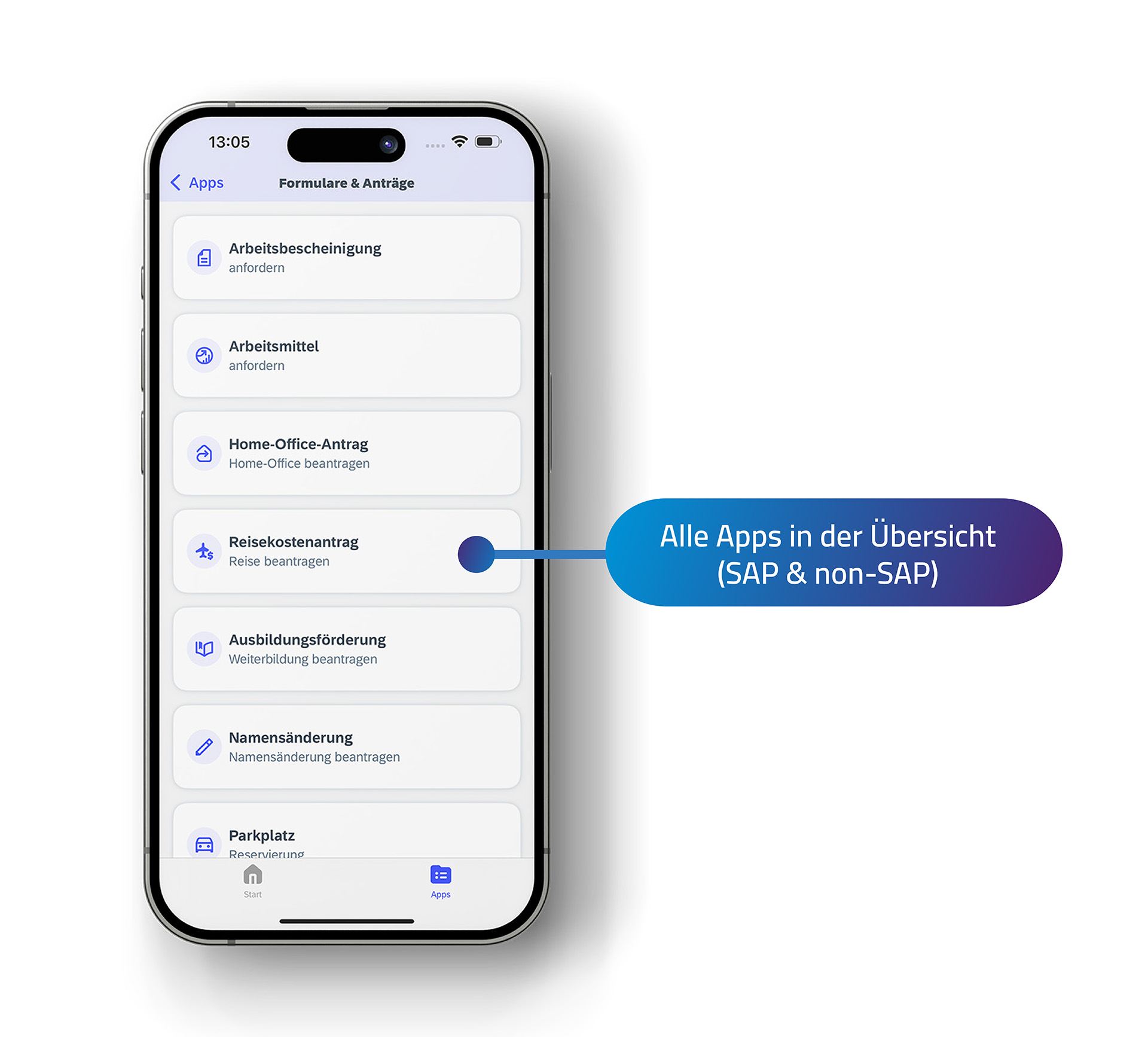 SAP Kunden können die App "SAP Mobile Start" verwenden. Es handelt sich dabei um eine native mobile App, die allen Mitarbeitenden als zentraler Einstiegspunkt für den Zugriff auf Anwendungen, Inhalte und Nachrichten dient.