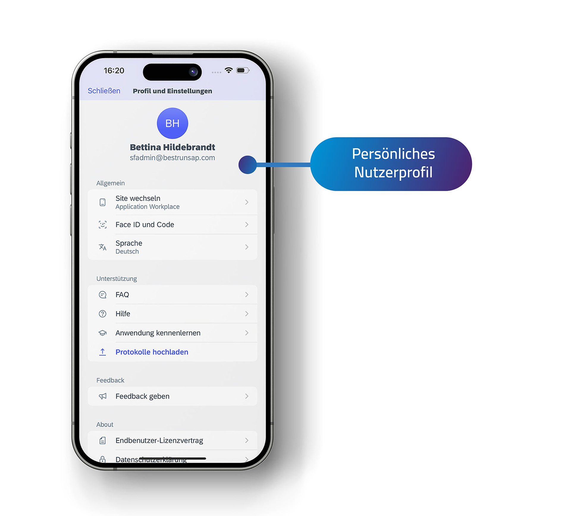 Neben ihrem mobilen, intuitiven Design fördert die App nicht nur Effizienz, sondern auch Vertrauen – denn jede Information und jeder Service ist sicher, relevant und genau dann verfügbar, wenn er gebraucht wird. Dank der sicheren Anbindung an SAP-Systeme (z. B. SAP SuccessFactors, S/4HANA, HCM, etc.) bleiben Daten geschützt und Prozesse zuverlässig automatisiert. Die Anmeldung erfolgt auf der SAP Business Technology Platform (BTP) über Single Sign-On, alle Zugriffe sind rollenbasiert und DSGVO-konform.