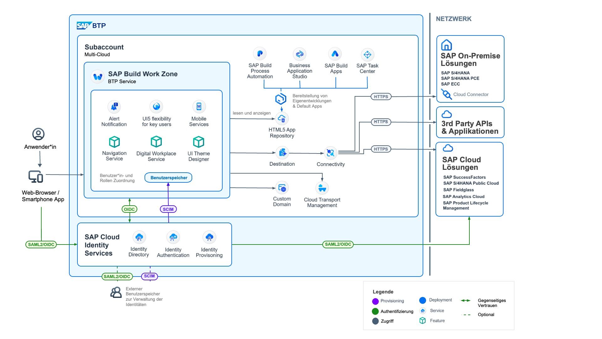 • Identity Authentication (IAS): Ermöglicht die sichere Authentifizierung und Single Sign-On für die Anwender*innen in der Cloud
