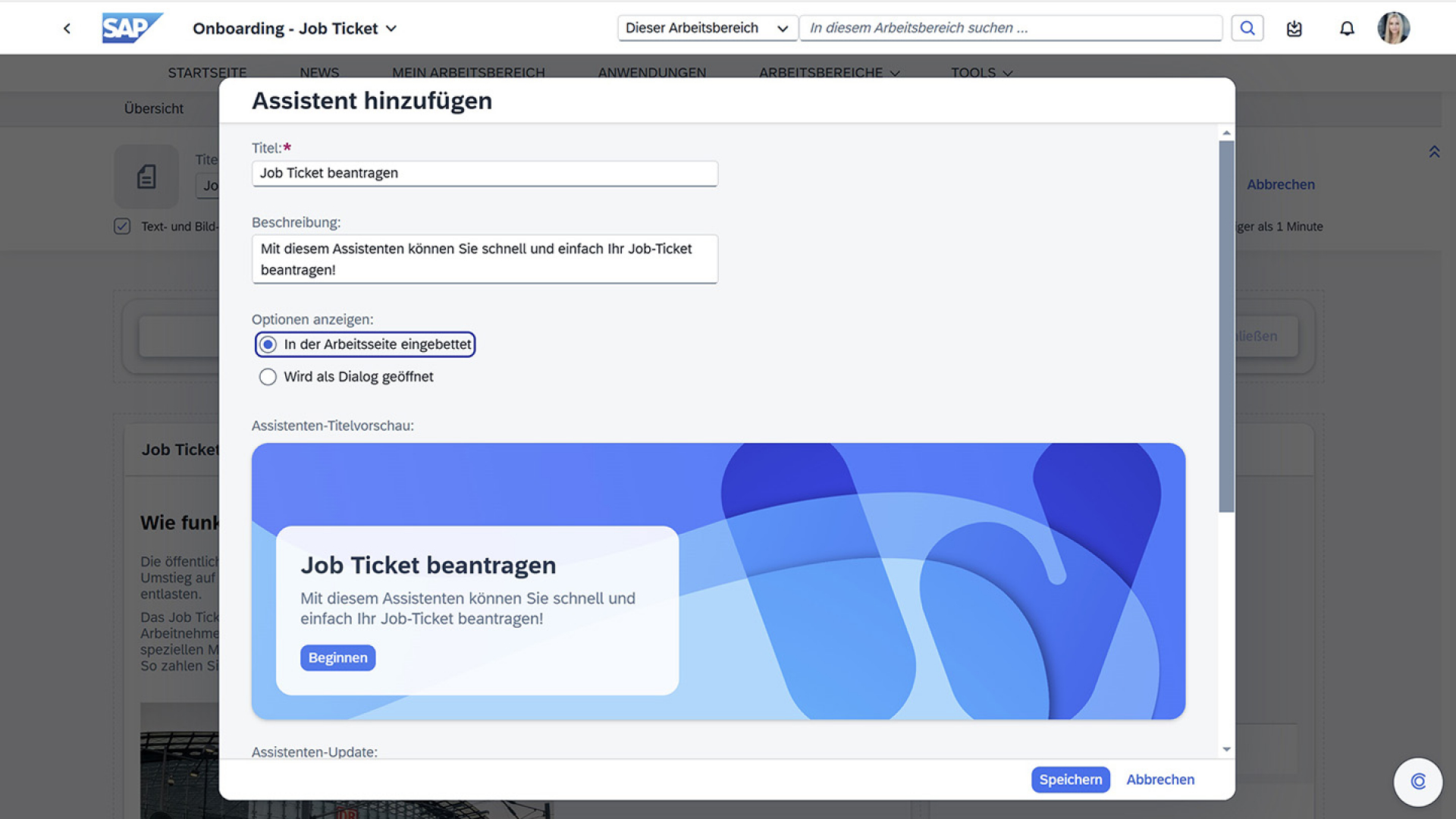Nach der Fertigstellung des Assistenten zeigt sich das Ergebnis aus Sicht der Anwender*innen, wie in Abbildung 9 dargestellt. In diesem Beispiel wurde der Assistent auf der Seite Job Ticket im Arbeitsbereich Onboarding erstellt. Die Seite selbst liefert grundsätzliche Informationen und Ansprechpartner*innen zum Thema »Job Ticket«. Über den Assistenten ist es nun auch für die Anwender*innen leicht möglich, das Job Ticket auf Wunsch zu beantragen. Der Erstellungsaufwand für ein solches Dialog- und Interaktionsverfahren, das die Benutzer*innen Schritt für Schritt durch einen komplexen Prozess leitet, ist erstaunlich gering. Das gezeigte Beispiel kann mit nur wenigen Mausklicks implementiert werden.