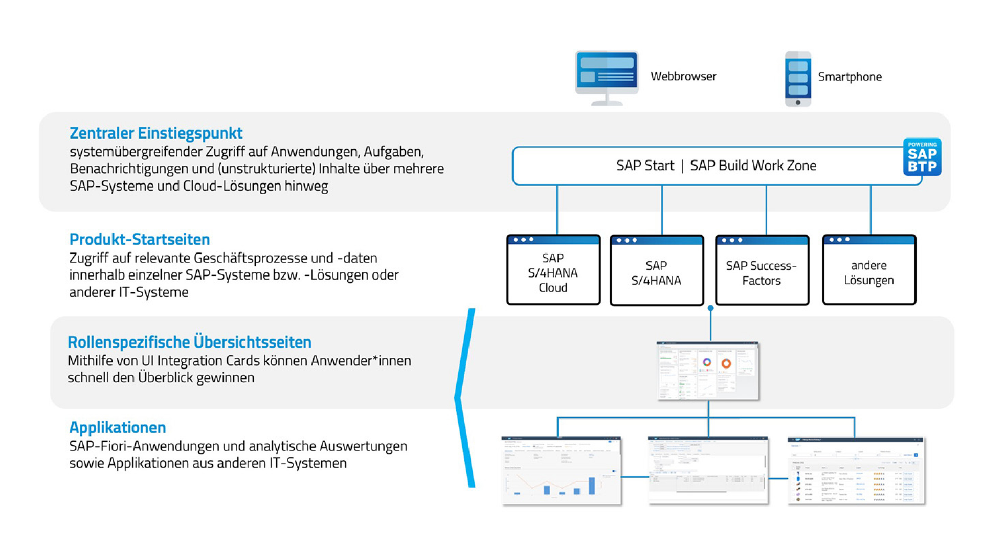 Für die zuvor beschriebenen Problemstellungen in heterogenen Systemlandschaften wünschen sich Anwender*innen seit jeher einen zentralen Zugang im digitalen Ökosystem von SAP mit seinen zahlreichen Geschäftsanwendungen: alles unter einem Dach, egal, ob am Desktop, Tablet oder Smartphone. Diese digitale Anlaufstelle soll den SAP-Anwender*innen innerhalb und außerhalb der Organisation einen möglichst unkomplizierten Zugang zu den Systemen und Services ermöglichen, die für ihre Arbeit relevant sind.