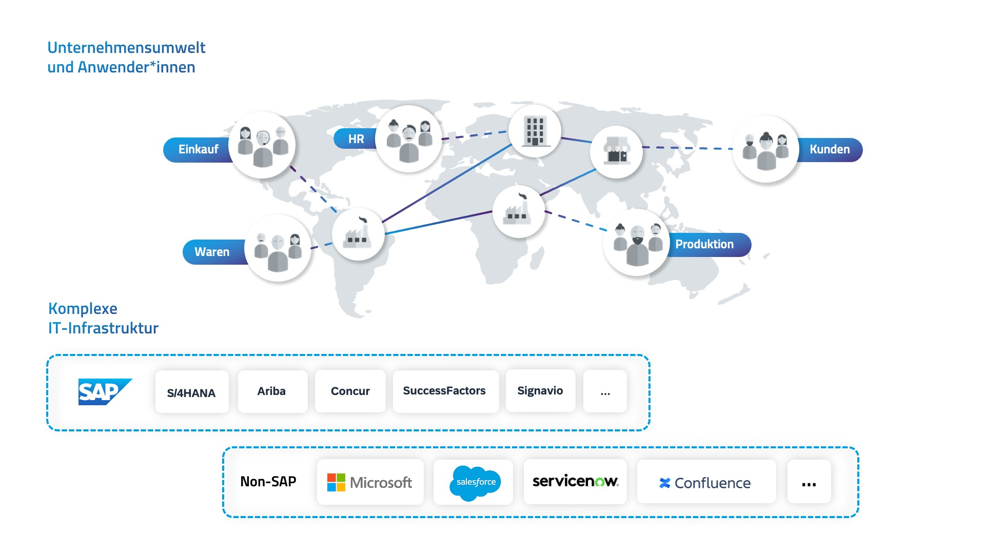 Ein klassisches Problem von IT-Landschaften und Geschäftsprozessen sind die sogenannten Silos oder Insellösungen. Diese Einzellösungen decken meistens nur einzelne oder einige wenige Anwendungsszenarien ab und stellen ein in sich geschlossenes System mit einer individuellen, proprietären Bedienoberfläche für die Mitarbeiter*innen dar. Bei SAP-Kunden sind diese Systemlandschaften oftmals historisch gewachsen: Angefangen haben die meisten vor vielen Jahren mit einem SAP-R/3-System, das sich über SAP ECC hin zu einem SAP-S/4HANA-System entwickelt hat. Hinzu kommen vielfältige Kombinationen weiterer SAP- und Non-SAP-Systeme: Es wurde vielleicht ein CRM-System eingeführt, eine HR-Lösung, Software für das Supply Chain Management, gegebenenfalls ein SRM-System, eine Data-Analytics- bzw. Business- Intelligence-Software, ein Digital-Asset-Management-System, Projektmanagementtools, Collaboration Software, und vieles mehr. All diese Geschäftsanwendungen kommen nebeneinander zum Einsatz und bestehende On-Premise-Systeme werden immer häufiger durch modernere, cloudbasierte Anwendungen abgelöst, sodass in den Unternehmen hybride Systemlandschaften betrieben werden, was grundsätzlich verschiedene Wartungsmodelle und Upgrade-Zyklen bedeutet. Die Mitarbeitenden in den Unternehmen, die oftmals an weltweit verteilten Standorten tätig sind, werden täglich mit all diesen Geschäftsanwendungen konfrontiert und müssen sich mit den verschiedenen Bedienoberflächen der Lösungen auseinandersetzen. Hier kann man schnell den Überblick verlieren, wie die nachfolgende Abbildung anschaulich darstellt.