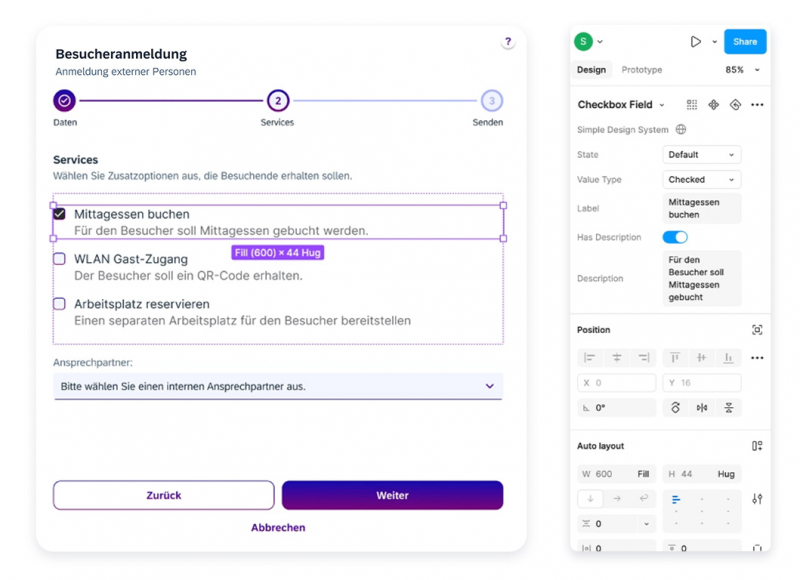 In meinem aktuellen Projekt habe ich eine UI-Card für die Besucheranmeldung mit dem Prototyping-Tool Figma visualisiert. Dabei wurde das SAP Fiori Web UI-Kit in Figma verwendet, um eine Lösung zu entwickeln, die sowohl den Fiori Design Guidelines entspricht als auch spezifische Anpassungen ermöglicht.